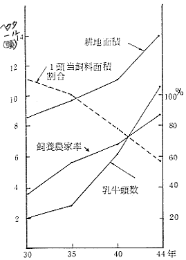 (3) 土地生産力:畑酪経営への転換初期においては土地生産力が低く、成牛1頭当り粗飼料面積が1ヘクタ−ル以上を必要とした。しかしその後土地改良が進み還元有機物の増加、輪作の合理化により土地生産力の向上と共に畑酪経営が進展した。