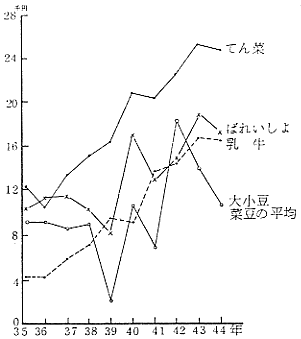 (5) 作付の対応:多肥多収性が強く、酪農部門との補完関係が高く、安定して高収益性をもつ、てん菜、ばれいしょ等の作付が拡大され、これに反した性格の豆類の作付面積が減少して主幹作物の地位を入れ替えた。