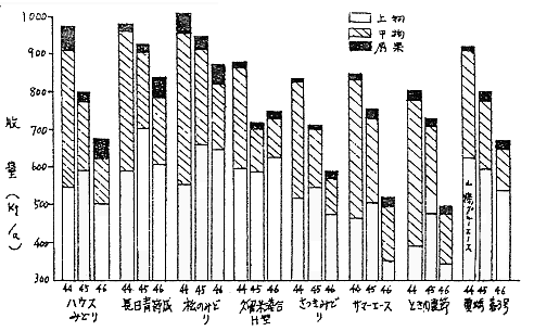 キュウリ促成栽培における品種ならびに地中加温に関する試験成績 (昭和44〜46年) 北農試作物第2部園芸作物第2研究室 担当者 小餅 昭二・田中 征勝 |