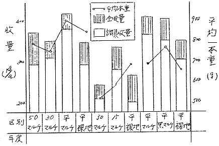 | 1. 高畦ポリマルチの効果(44年〜46年) 高畦50cm 30cm 15cmと平畦にそれぞれポリマルチを併用 |
