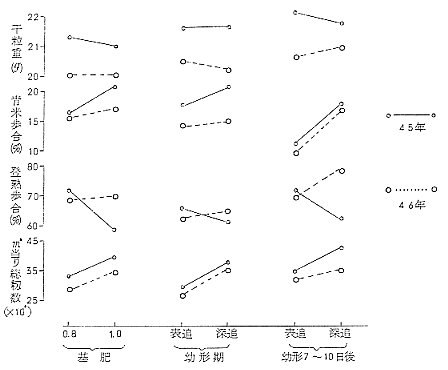1) 深層追肥は登熟性を幾分不安定による要因を含むので、特に低温年の使用並びに追肥量