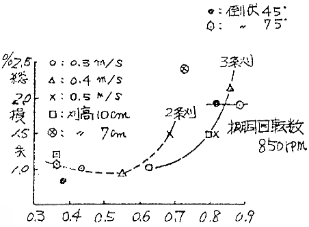 | 1. 試験期日 昭和46年10月8日〜21日 2. 試験場所 空知郡栗沢町砺波 3. 供試機種 普通型コンバイン、刈巾1.8m 1台 乗用自脱型コンバイン(2条刈、3条刈)2台 4. 供試面積 34.0ha 5. 対象品種 渡育150、ほうりゅう、ゆうなみ、ゆうから 6. 測定方法 OECDテストコ−ドによる (1) 作業精度試験 (2) 作業性能試験 |