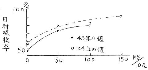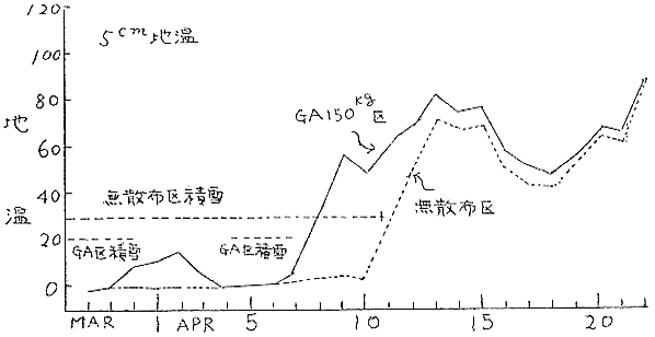 | ①試験地−羊ヶ丘圃場 散布量(手散布)−150kg/10a、100kg/10a、50kg/10a、50kg/10(條播)、25kg/10a(條播)、 徹布日−3月18日または3月19日 ②測定項目:気温、地温、積雪深、日射吸収率、日射量 ③熱収支式に基づく融雪促進日数の計算、実測値との比較 |