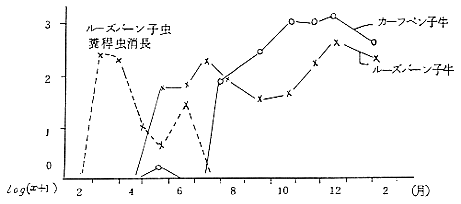 2. 検出された虫類はク−ペリア・オンコフォ−ラ・オスタ−グ胃虫、および牛稔転胃虫が大勢を占め、年間の消長はル−ズバ−ン飼養牛は7月と11月にピ−クをもつ2峰性を示したが、カ−フペン飼養牛は12月をピ−クとする1峰性で両群とも冬期まで感染子虫の排出を認めた。
