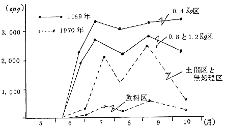 (2) 線虫排卵数の急増期になる7月下旬に糞便検査により1.000epq以上の排卵牛が多いときは若干牛全頭に対し駆虫を実施し、駆虫群清浄牧区に転牧することが望ましいが、不可能な場合は8月下旬にさらに駆虫することが望ましい。