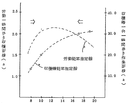したがって、現行の機械利用を前提とした場合は、機械の稼働効率を引き下げても、組作業人員を縮少−生産組織の構成農家数規模の縮少−して、労働効率を高めることが、作付拡大の可能性を作り出すと言える。