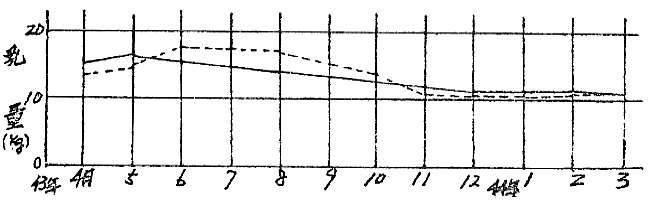 理論乳量曲線と実乳量曲線の比較 実線=理論乳量曲線