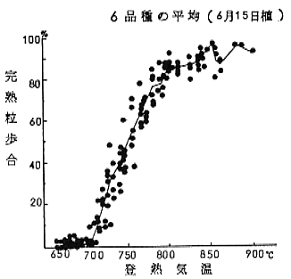 第1図 成熟期の完熟粒歩合と登熟気温(47年)