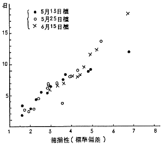 第2図 主稈とⅡ次分けつの出穂差と穂揃性(47年)
