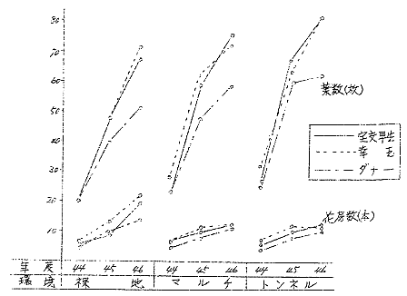いちご病害虫防除による、増収技術確立試験 (1)道内地方におけるイチゴの栽培試験 ①プラスチック、フイルム被覆栽培における形成 道南農試 園芸科 |
