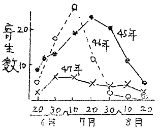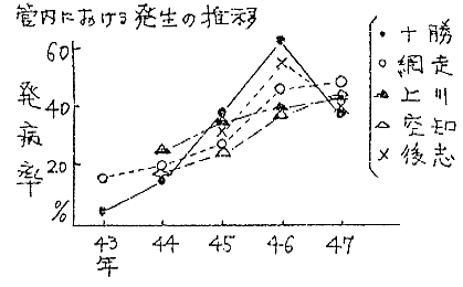 ①45〜47年、道内各地の発生状況を調査した結果、本病は全道各地に分布し、発生率は年々増加の傾向にあり、46年には青森県での発生が確認された。