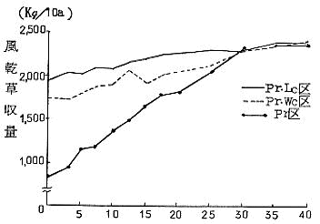 ①生草収量では、ちっ素施用量に関する全水準についてPr・Lc>Pr・Wc>Pr の関係が認められた。