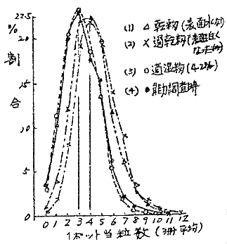 播種量は、ロールとプラン間隙により箱移動速度の1.32倍である。播種量は350ccで10c㎡当り392±27粒であった。