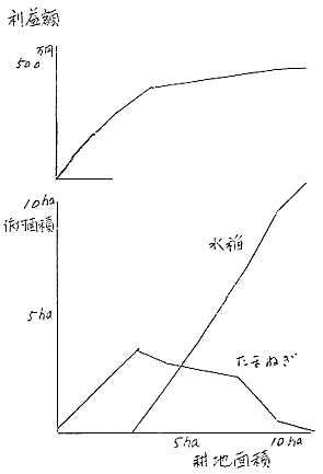 たまねぎは価格変動が大きいが、しかし、水稲と比較すると収益が高い作物である。また栽培技術の向上により排水良好な水田転換畑では熟畑と変らない収量が可能となり、転作が急激に増加した要因となる。そこで家族労働力2人たまねぎ収量5t/10a当り等を前提に経営計画を作成した。その演算結果を概説するとたまねぎの価格中位(ここ10年間の平均780円/20kg)なとき4haまではたまねぎ単作5〜6ha水稲、たまねぎ複合7ha以上は水稲中心の作付がそれぞれ有利となる。またたまねぎの値格が低下するとほぼ水稲転作となろう。従って現状のたまねぎ価格を前提とするなら、5ha以下はたまねぎ単作もしくは水稲との複合形態7ha以上は稲作経営が安定的で有利と推論できる。但し雇用労働確保が遂次困難となり、たまねぎ栽培における省力化は急がれる。