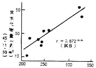 第3図 越冬前の株部炭水化物含量と春の茎数との関係
