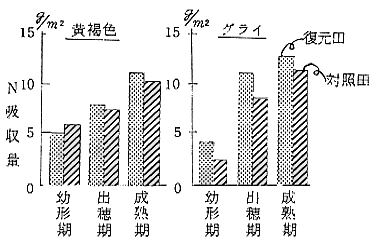 4) 玄米収量からみた復元田のNの適量は、黄褐色及びグライ土壌とも、対照水田より夫々N2kg/10a前後低いレベルにある。N追肥の効果は黄褐色土壌でみられるが、グライ土壌ではその効果は認められず、寧ろ減収を招く。復元田では全般的に対照田に比して登熟歩合が低く、青米歩合及び屑米重が高い。