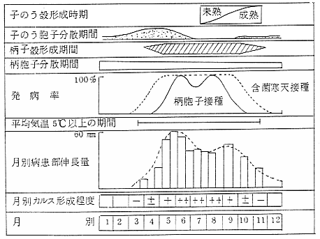 本病の発生生態について、とくに発病条件が明らかとなり、また有効薬剤が検討され、防除効果が認められたが、本病防除の要点は病原の除去、樹体の健全化におく必要がある。
