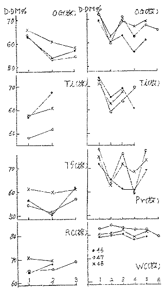 | 1)供試草種: | オ−チャ−ドグラス、チモシ−、ペレニアルライグラス、ト−ルフエスク、 アカクロ−バなどの6草種、37品種についてDDM、飼料成分分析 |