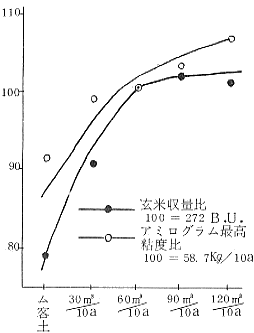 ①泥炭地水田に対する客土量は従来、主に玄米収量の増加をねらって60〜90m3/10aでよいとされていたが、米質的には120m3/10aでもなお効果の発現を認めた。