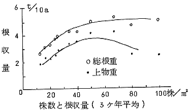 ・ 2本立株が40%あっても、総根数で4.000〜6.000本/aに押さえられる栽植密度にすれば収量は低下しない。しかし、2本立て株が増せば平均一根重は低下する。