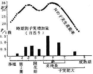 1) 礫耕法によってNに対する基礎試験を実施した結果によると、矮性菜豆の子実生産に対するNの供給は生育の全期に亘って必要であり、そのうちでも茎葉の増大が著となる第2葉期頃から着莢数の決まる子実肥大期にかけ重要であり、更にそのうちでも開花期間中が最も重要な時期と考えられた。