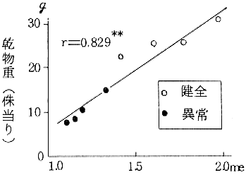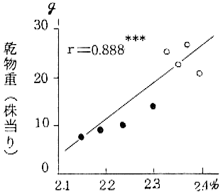 2) 作物体のK濃度と乾物重並びに土壌中の設置性K含量の間に夫々極めて高い正の相関(r=0.888***、r=0.859**)が認められ、作物体及び土壌中のK含量の高いもの程、生育障害の発生程度が軽く、イチゴの生育量、乾物重が高まる傾向を示す。