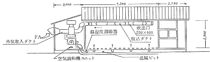 | 3) 空気調和装置 | 三方向切横ダンパユニット 加湿湿度機連動 送風量85m3/min(最大) 〃 0.4m3/ton(貯蔵中) |