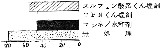 2. プルスフォグ煙霧法のTPN水和剤75%(ダコニ−ル)は薬量167〜250g/10aに拡散剤(ダマジエット)10倍液を3L/10a使用煙霧散布する。