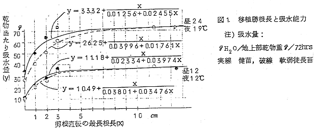 4)移植直後の乾物当たり吸水量(y)と剪根直後の根長(x)はy=c+x/(a+bx)で示される関係にあり(a、b、cは移植以降の温度条件および苗質によって定まる常数)xが3cmより小さくなるに伴いyの低下が著しくなる。(第1図)