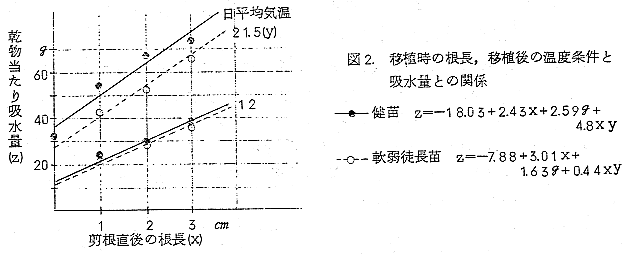 移植10日間後の生育量(最長根長、草丈増加量、葉数増加量)(y)は移植直後の苗の乾物当たり吸水量(x1)と移植以降の気温(x2)の函数としてよく表される。