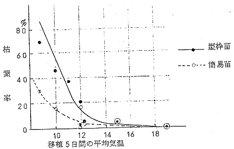 2) 平均気温12℃以下では枯葉率が急増する。その程度は簡易マット苗に比して極めて大きい。