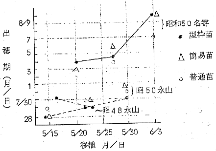 1) 良地帯(永山)での晩植では、簡易マット苗に比し出穂は早い。この地帯のイシカリでは5月末の移植においても7月末日までに出穂する。