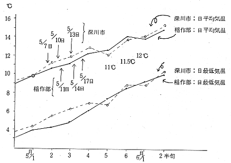 第1図 平年における活着限界温度の出現日(稲作部:20年平年値、深川市:10年平年値)