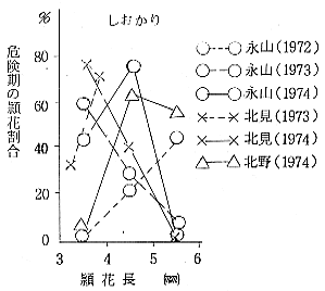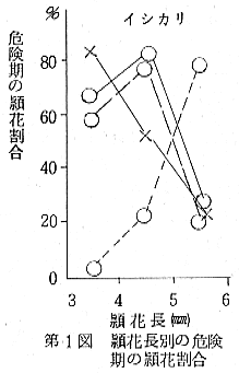 危険期の穎花長の範囲は3〜6mmで、同じ品種でも地域・年次により異なり、危険期にある穎花割合のモード、パターンが著しくことなった(第1図a−c)。