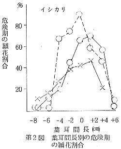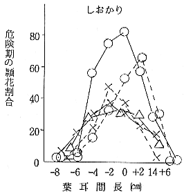 危険期穎花が存在する葉耳間長は地域・年次・品種により異なるが、葉耳間長0cmを中心として土5cmの範囲にすべて入った(第2図a−c)。また株全体としても同じであった。
