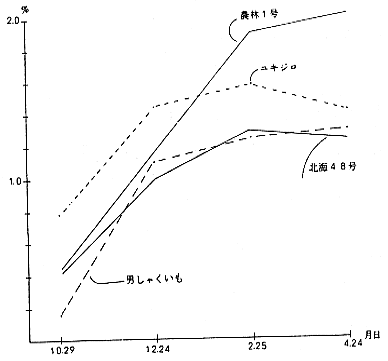 | 農林1号 | 6.3 | 7.6 | 9.19 | 76 | 3.8 | 81 | 13.9 | 100 | 100 | 112 | 16.6 | 61 | 31 | 8 | 1 |