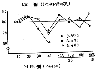 Ⅱ-1 N用量(48〜49、中央農試):N10、20、30、40kgおよび20+追肥10(活着直後−A、球肥大始−B、倒伏直前−C)10+追肥10kg2回(A、B)の計8処理