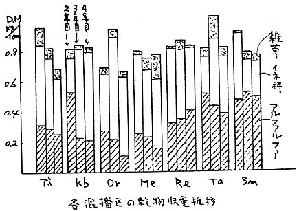 試験−2 1)アルファルファおよび総生産量、マメ科率の推移、草型の均衝からみてSm、Ta、Ti、Reが随伴イネ科適草種であった。 2)越冬直前時刈取りにより、翌春のアルファルファの枯死株率が高まった。無刈取りでもKb、Me、Orで高い枯死株率を示し、一方Ta、Sm区の被害率は軽微であった。 3)越冬直前刈取りは、イネ科、マメ科共に減収を招き、特にALは皆減的であった。これは表広結氷に伴う通気障害による枯死と考えられた。