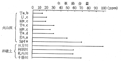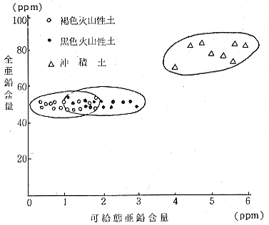 1.火山性土は、沖積土と比較すると全亜鉛可給態亜鉛含量とも低い。火山性土では、作土および心土を構成する火山灰の可給態亜鉛含量が低く、亜鉛欠乏の発生する条件下にあった。