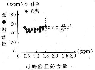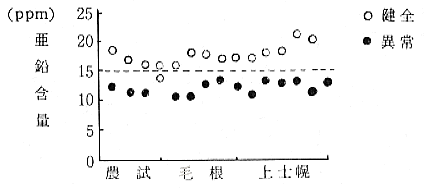 3.亜鉛欠乏症の発生する亜鉛含量の限界値は、土壌中の可給態含量が1.5ppm前後、作物体では第5〜8葉期において15ppm前後と推定された。また、褐色火山性土において可給態亜鉛含量と腐植含量との間に高い相関が認められた。