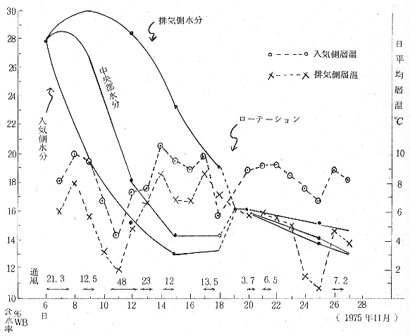 (1)原料4.5tonを用い、間断通風と1回のローテイションにより、3週間で15%以下の製品となった。送風総時間は147.6時間であった。風量は初期水分kg当り0.084m3/s
