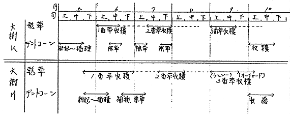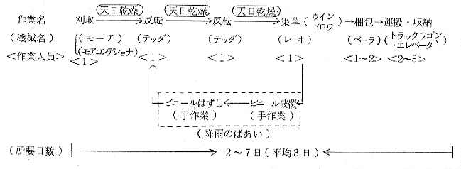 (2)乾草の収穫作業体系はモーア(刈取)→テッダ(反転)→レーキ(集草)→ベーラ(相包)→トラック・ワゴン(運搬)であり、平均3日で仕上がる。天日乾燥に依存していることが基本的な問題点である。