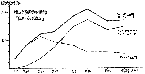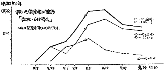 昭和50年は前年現地で4時期別に収穫した種いもを北見農試ほ場で検定、種いも大きさ60〜