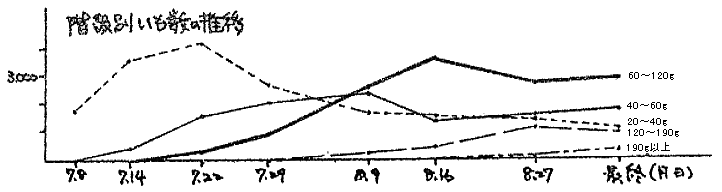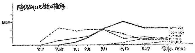 7月上、中旬よりほぼ一週間ごとに抜取り、大きさ別いも個数、重量調査、供試品種 3品種