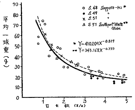 3)前年までと同様、平均一球重は栽植密度の指数関数として表すことができ、単位面積当りの総収量は密度の増加にともなって増加する。