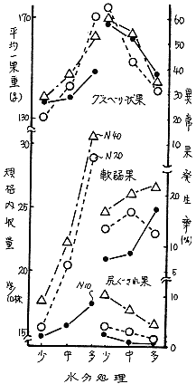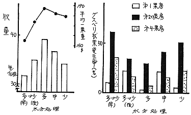 2)多水分により栄養生長が旺盛になったものほど、着果数・平均−果重が増加し、収量が向上した。そのような収量向上条件下だはグスベリ状果が減少した。一方、軟弱果は、多水分多N条件で増加する傾向を示した。