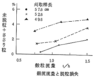 1) 性能試験における最大殻粒処理量は1.5T/hで脱粒損失が5%であった。