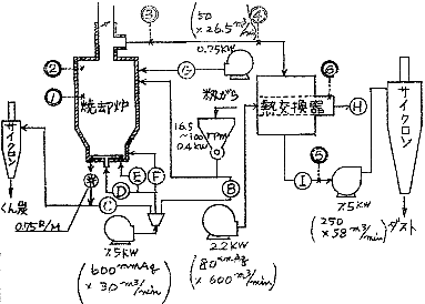 4) なおダスト口からの排気は120〜130℃・50m3/min強でバイジン濃度も0.26g/n−m3 と少なく、まず熱交換機へ、フィ−ドバックできるし、ダスト除却方式および乾燥方式の検討により熱交換機を省くことも考えられる。従ってこの場合には、より充分な熱が供給される。