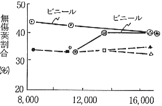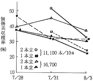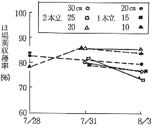 2) 無傷収穫率は2本立が1本立より高く、時期の経過に伴い減少する。