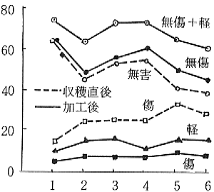 4) 缶詰、冷凍加工の結果、ブランチによって傷が見にくくなり、10% 以下にとどまった。軽が20%前後でしたが、製品としては供し得る品質であった。